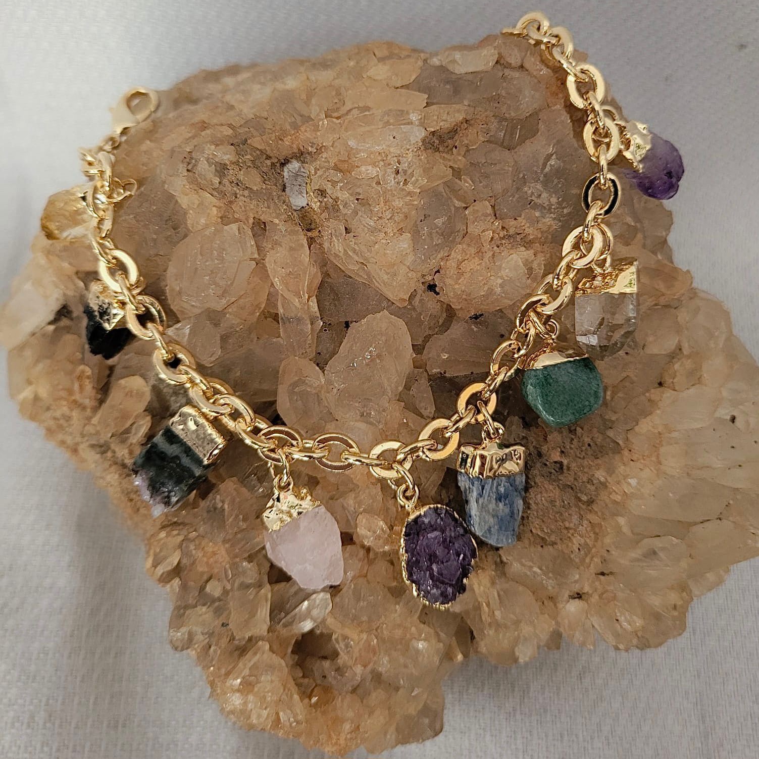 Pulseira com Cristais em bruto, significa que é um escudo em diversas áreas de proteção, lucidez, saude, Amor, etc… combate energias densas, cumpre o papel de varias energias acolhedoras. Eleva entre o espitito, corpo e mente.