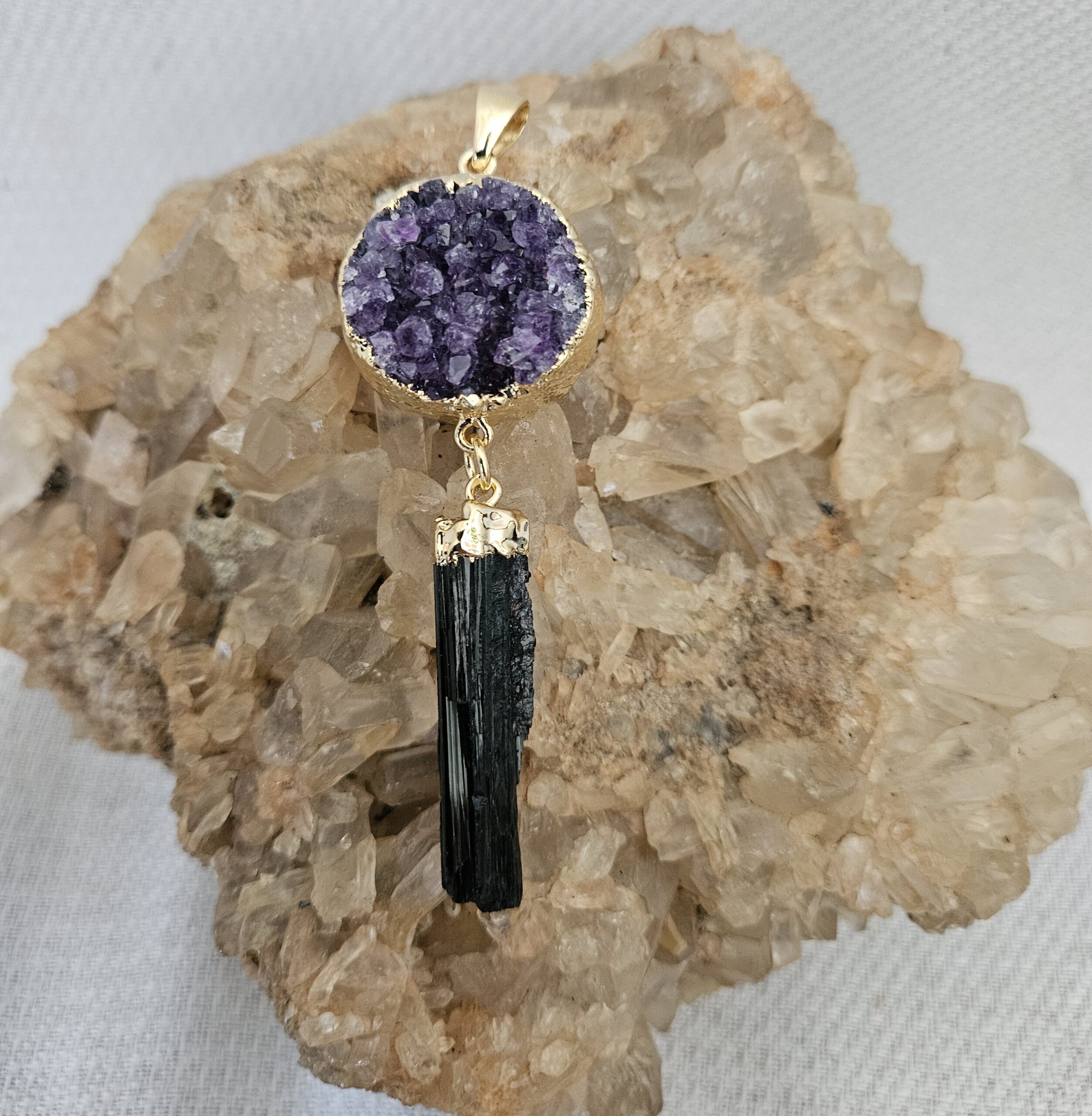 Pingente com as pedra de Turmalina Negra em bruto, com a pedra da Ametista, um poder de proteção fantástica.