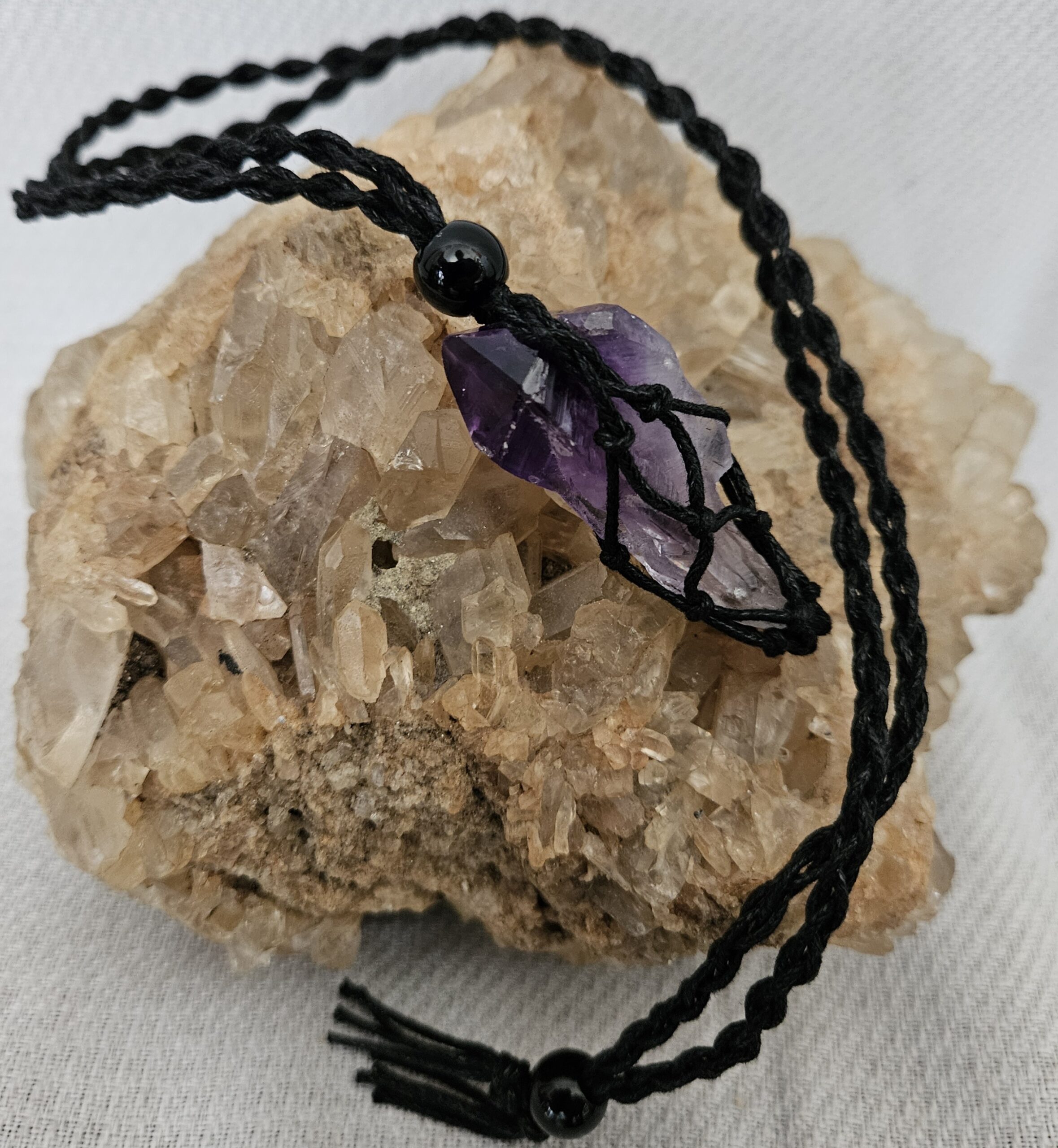 Fio muito bonito com a pedra em bruto da Ametista, já energizada para sua protecção e com clareza do 3″ olho afinado.